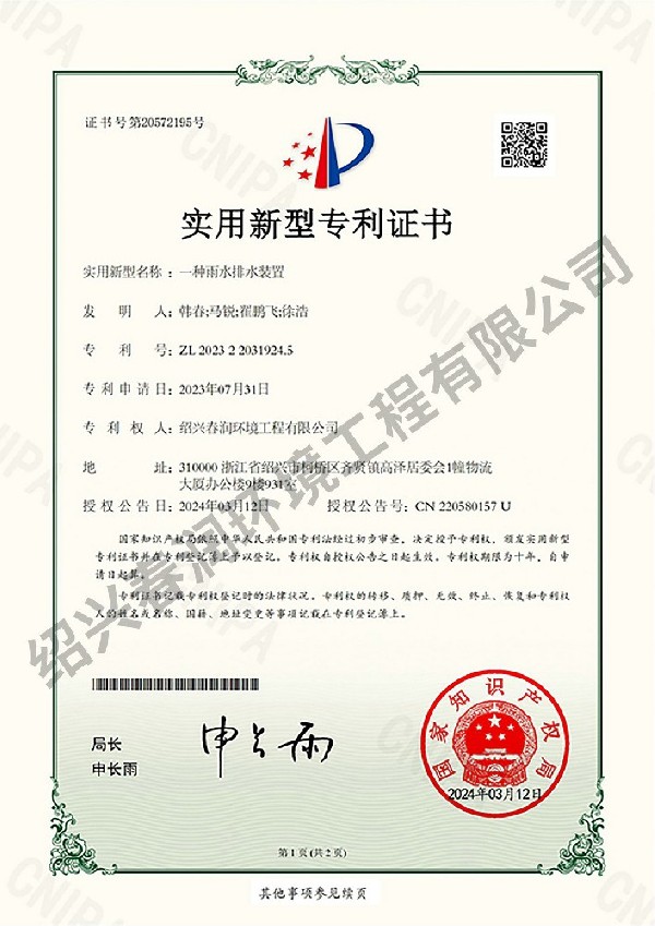 一种虹吸排液装置-绍兴春润环境工程有限公司-实用新型专利证书